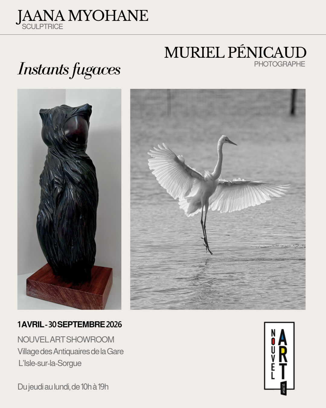 Le Nouvel Art Showroom , à l’Isle sur la Sorgue, accueille « Instants fugaces », une exposition réunissant la photographe Muriel Pénicaud et la sculptrice Jaana Myöhänen. Deux médiums, une même attention portée à la présence furtive des êtres et des choses.